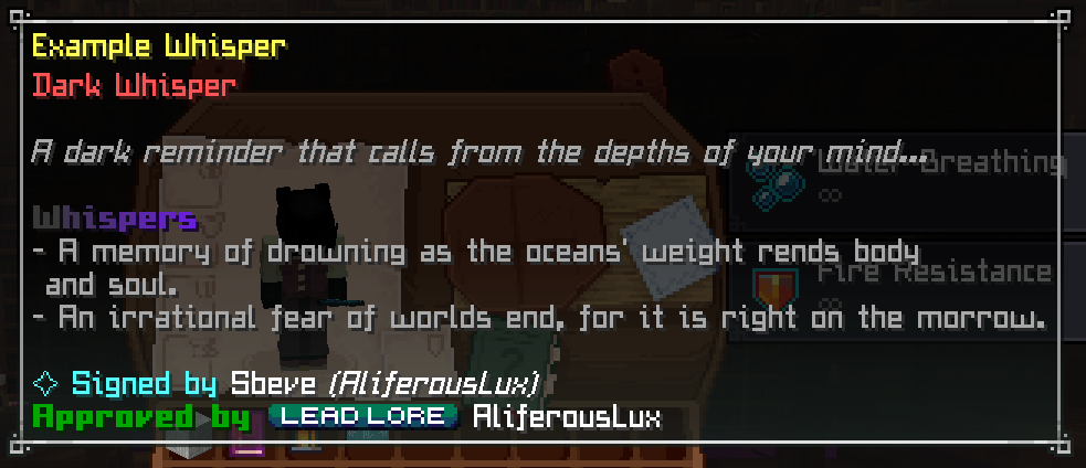 During the vestigial creation, players must write down any dark whispers bestowed. These whispers will be imprinted onto an item that the player must keep in their inventory at all times.